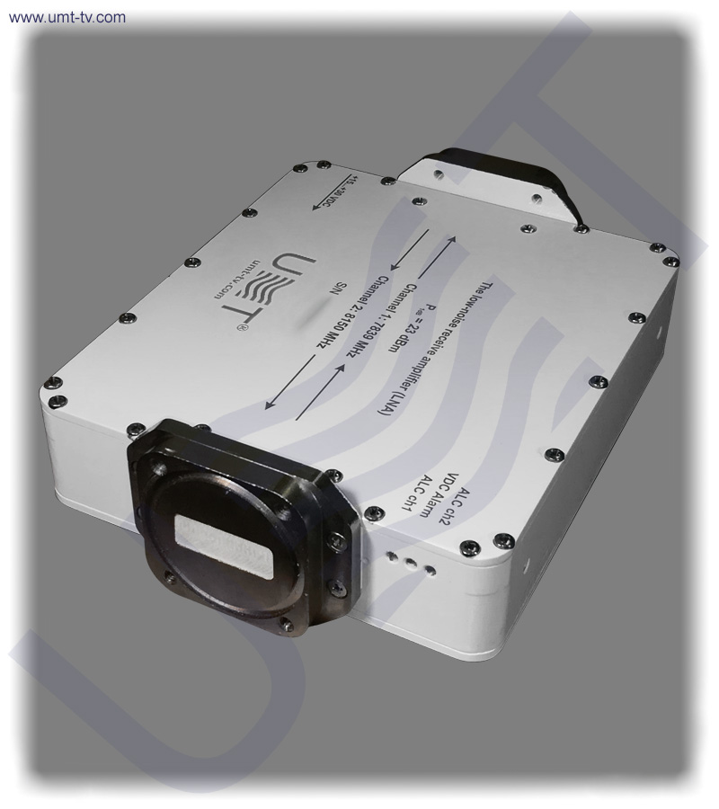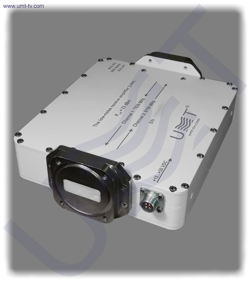 At X-band repeater block inputs / outputs are located the strip / waveguide adaptors. Their waveguide flanges are used for connecting the low-noise amplifier modules to the antennas. The voltage of X-band repeater block is supplied via PC4 type connector.
